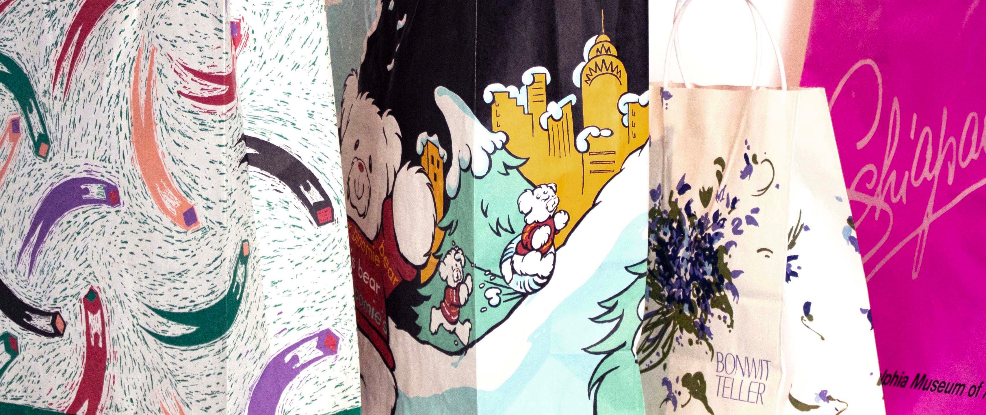 Deborah Larkin ’70 presents an exhibition drawn from her personal archive, featuring a collection of vintage shopping bags she used as teaching tools during her years on the faculty at Moore College of Art & Design. In the late 1970s and early 1980s, retail stores used shopping bags as signature pieces to promote their identity and communicate their message. Larger stores frequently updated their designs seasonally or to mark special events. Iconic examples, such as Michael Vollbracht’s illustration of a woman’s face for Bloomingdale’s, became showstoppers and fueled a competitive era of well-designed bags in the retail industry. Once—and still—a powerful vehicle for branding, these bags demonstrate how design shapes consumer identity, conveys values and transforms everyday objects into visual statements.